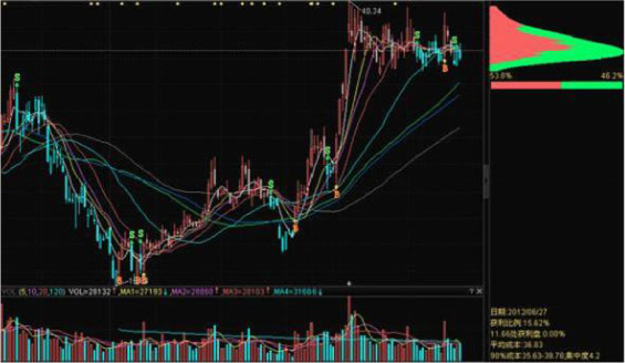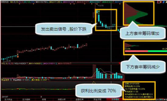 在随后几天的走势中,可以发现底部筹码有明显缩减,特别是15、16号2天,而上方筹码在16号又增加了,按当天收盘价看,这部分的筹码绝大部分处于套牢状态,获利比例也由原来的90%变成70%,再往后看17号操盘线发出卖出信号(S点),截止这天收盘价看,底部的筹码减少了很大一部分,上方也套牢了很大一部分筹码,之后股价没有明显快速下跌。