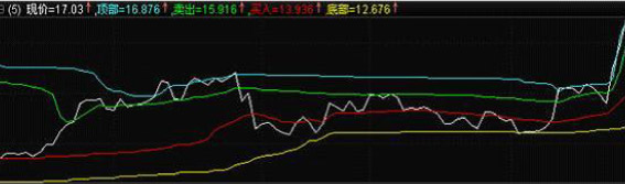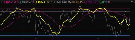 长、中、短 期趋势显示,便于用户明确股价当前走势的状况。顶部的红色区域和底部的蓝绿色区域用于用户识别股价走势的高低和超买超卖情况。最底部的绿色方块显示阶段性底部,出现的红点意味短线抄底信号;而顶部的红色方框表示阶段性头部区域提示用户要谨慎。用户使用时以黄色的中期趋势线为主要的判断依据,结合灰色短期线和红色长期线把握买卖点,当长期趋势线向上时尽量选择短期线回调时进场,反之要注意高抛止赢止损。可作为操盘线的有效辅助判断工具。