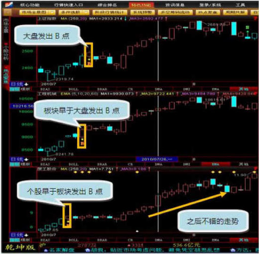 找到大盘出现买入信号(B点)、随后找到提前大盘出现买入信号(B点)的板块、最后找到提前板块出现买人信号(B点)的个股,三者层层递进,环环相扣,从而找到市场上的热点板块中的热点股。