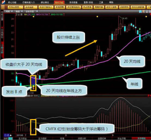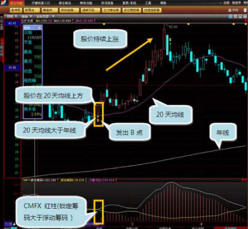 五矿发展(600058)该股在2011年2月14号,同样当天操盘线也是发出了买入信号(B点),筹码分析指标(CMFX)锁定筹码大于浮动筹码,并且20天均线大于年线(250天均线),股价在20天均线上方。