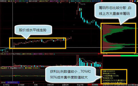 华阳科技(600532)2010年 7月至9月这3个月时间中,股价成水平线走势几乎看不出涨跌,无论从成交量还是技术指标上都看不出什么猫腻,但是通过多空筹码流动可以看出主力在运作的迹象。在7月初大盘经历了一次比较像样的反弹,但是该股并没有明显的上涨,筹码形态也是比较的分散,在现价线(白线)的上方有大量的套牢筹码,获利比例的数值是非常小的,70%成本和90%成本集中度数值也是比较大的,这个时候主力是不太可能拉升的。