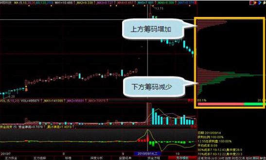 到了9月14日,上方又多了一堆筹码,说明随着股价上涨有新的资金看好该股或是趁着股价上涨跟风追入,但是这天原先在下方密集的一堆筹码依然还在,虽然有些缩减但不是特别明显,此时,持有该股的投资者可以心放的更宽一些。
