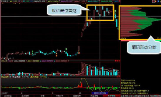 在10月底股价高位震荡,涨幅明显缩窄,筹码也从之前低位集中的单峰密集形态变为分散,当看到操盘线卖出信号(S点)发出时应该知道主力已经出货完毕,投资者也应该获利了结。
