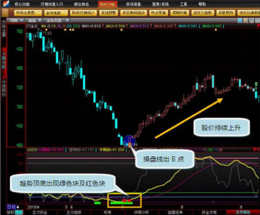 ST金化(600722)2010年4月初经历了一系列的单边下跌后,在2010年7月2号,趋势顶底指标的底部出现了绿色块及红色块,当时操盘线状态为蓝色续币,7月5号继续下跌,直到7月6日,趋势顶底指标的底部再次出现了绿色块及红色块,同时操盘线日线发出了B点买入信号,之后股价一路上涨。