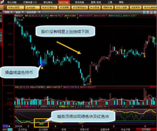 操盘线侧重于盘后分析,通过对股票形态判断,在个股有可能进入拉升期前的相对低点发出买入信号(黄色向上箭头),经过一段涨幅以后,判断相对高点发出卖出信号(绿色向下箭头)。可看到波段交替显示的红、绿两种颜色的K线即为“操盘线”。在上升段,持续以红色表示,空心K线代表当日股价上涨,收阳线;用实体蓝心K线表示当日股价下跌,收阴线;反之在下跌段中以蓝色显示,用空心K线表示当日股价上涨,收阳线;用实体K线表示当日收阴。红色波段表示持有,蓝色波段表示空仓信号。转换的时间即为买入卖出操作,用B点S点表示。