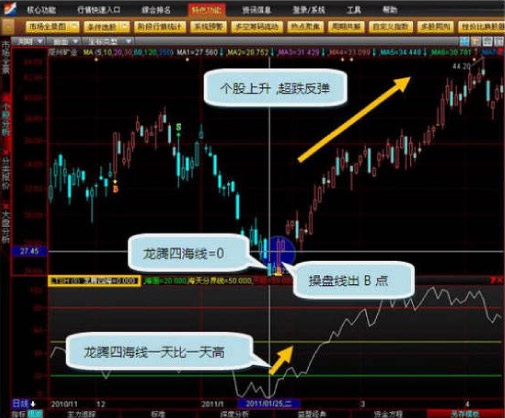 龙腾四海线为0说明个股到了阶段性底部,随时可能反弹,而龙腾四海等于0之后,一天比一天高,说明该股进入反弹趋势,之后可能会有一波相应的反弹。第3天出了B点确立了反弹趋势的形成,这时正是我们介入的大好时机。