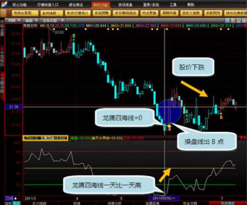 莱茵生物(002166)在2011年5月30日同样也是龙腾四海数值为0,之后龙腾四海一天比一天高,在6月1日当天也发出了B点,之后股价却是下降的。