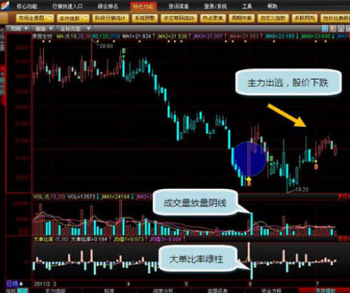 大家可以很明显的看到,之后一天成交量是放量的阴线,并且大单比率为绿柱,说明主力在出逃,而且从柱状的大小来看,主力有明显大量逃出的现象,之后导致股价下跌。