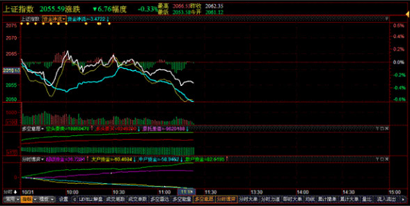 将软件图形切换到K线状态,从下拉菜单中选择“特色功能”,用鼠标单击进入“多空筹码流动”,即进入筹码流动状态。进入移动筹码流动状态后,在K线图的右侧显示若干根水平线,线条的高度代表价格,线条长度代表持仓筹码在这一价位的比例;线条上红色部分代表在这一价位内主动性买入成交所占比例,蓝色部分代表这一价位内主动性卖出成交所占比例。随着十字光标的移动,线条长短会变化,指示不同时候的持仓成本分布状况。