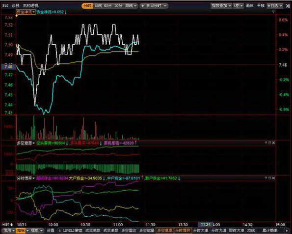 在多空筹码流动指标中,筹码位置的不同表示成本价格的不同。在现价线(白线)上方的称之为套牢筹码,在现价线(白线)下方的称之为获利筹码,如果市场上大部分筹码都是处于获利状态,主力要进行拉升相对比较容易,反之如果市场上80%-90%的筹码都是处于套牢状态,那么主力要拉升有比较大的难度,要把原先上方的套牢盘清洗出局之后,再把筹码吸收了才能进行拉升。